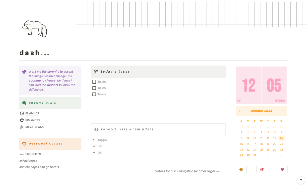 Cute Dashbooard with a "mindful nook" at the bottom to help with personal awareness, planner & more!